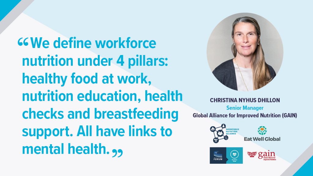 “Nutrition is often linked most closely with physical health but there are strong associations with mental and emotional health, and this is bi-directional. Your mental and emotional health affect your diet and your diet affects your emotional and mental health” said Christina Nyhus Dhillon Senior Manager, the Global Alliance for Improved Nutrition (GAIN). She participated in Consumer Goods Forum’s Collaboration for Healthier Lives (CHL) latest podcast episode, together with Erin Boyd Kappelhof, Co-CEO of Eat Well Global, to explore the connection between mental health and nutrition. They concluded that workforce nutrition can be an important lever to promote employee well-being.