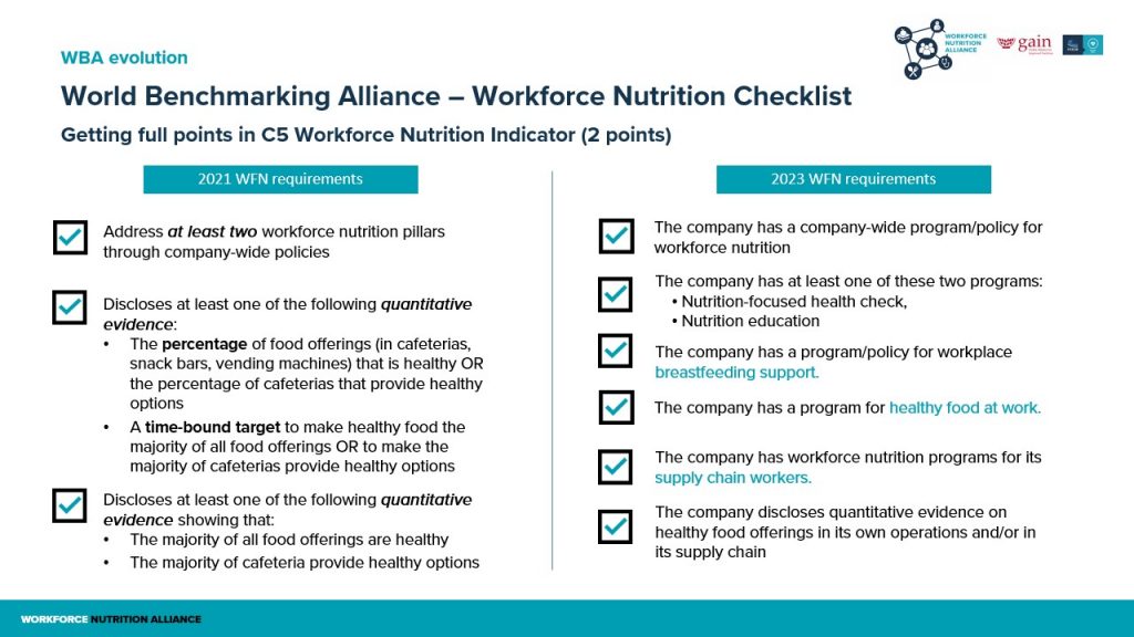 This benchmark measures and ranks 350 of the world’s most influential food and agriculture companies on their contributions to transforming our global Food System. The companies are measured against 46 indicators in four overarching categories. Workforce Nutrition (C5) is one of the six indicators within the Nutrition category.